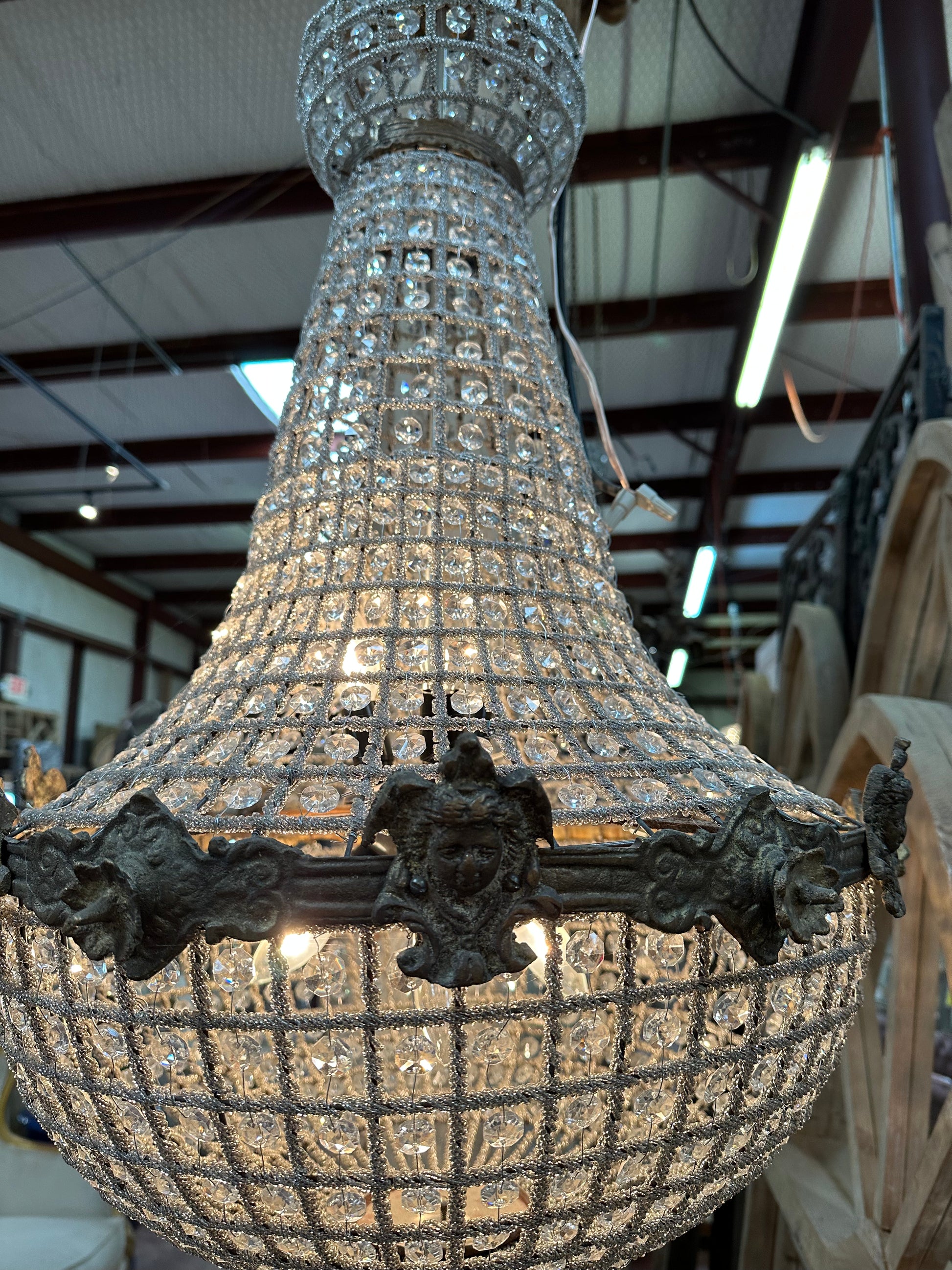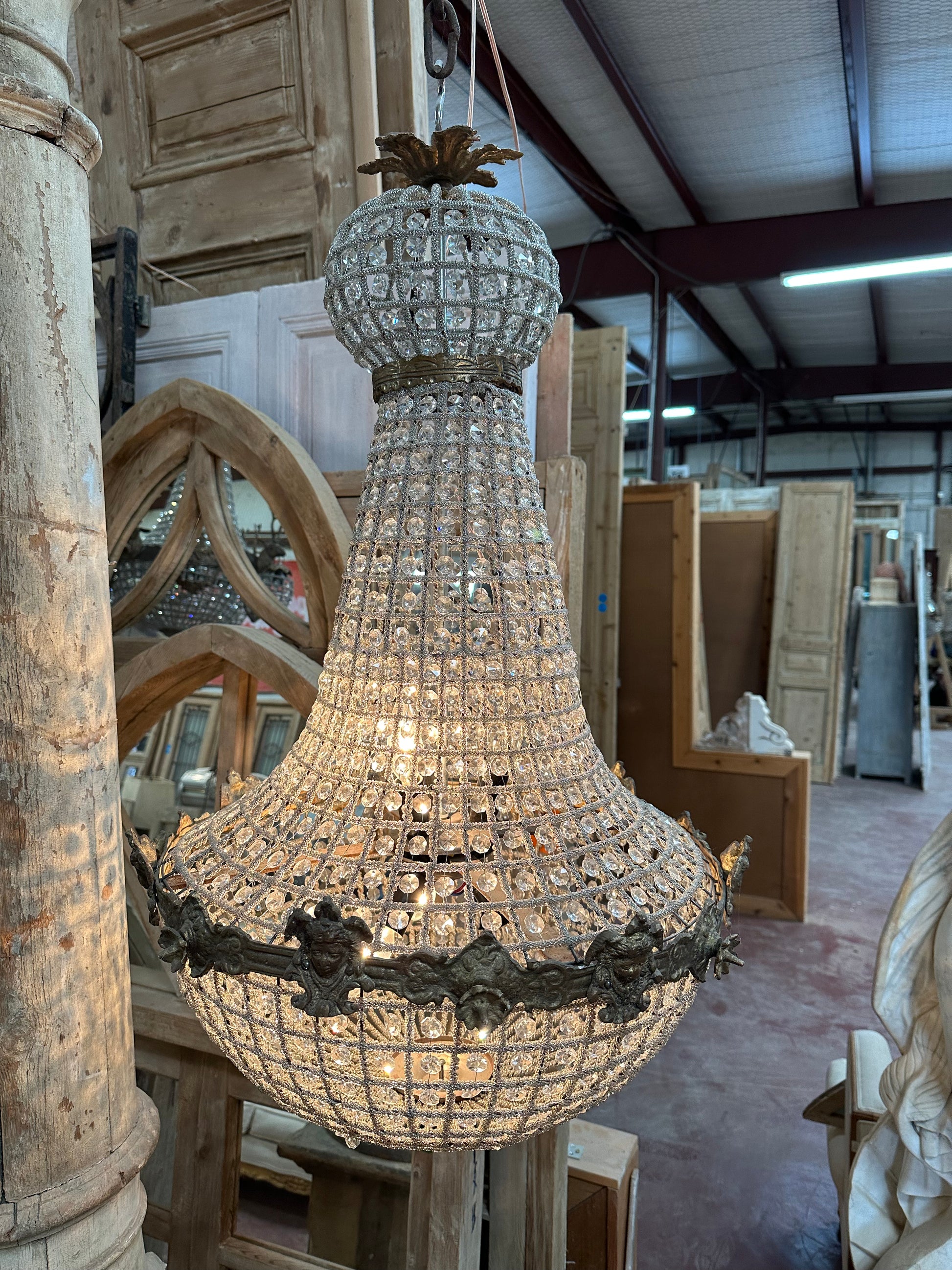 French Chandelier - Beaded Chandelier Lighting with Crystal, Glass Pearls and Brass Decor - French Hanging Lamp Fixture. Chabdelier is 40 inches tall by 20 inches wide. This is a reproduction.